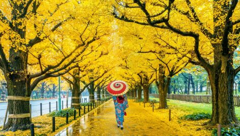 درخت جینکو زرد در پارک پاییزی توکیو
