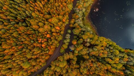 عکس هوایی درختان پاییزی زرد و نارنجی