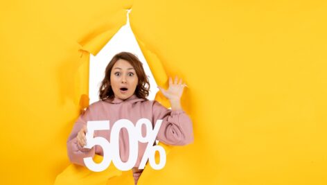 دختر با نشان تخفیف پنجاه درصد