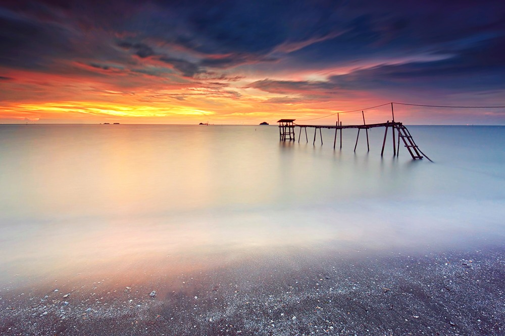اسکله متروک در ساحل هنگام طلوع