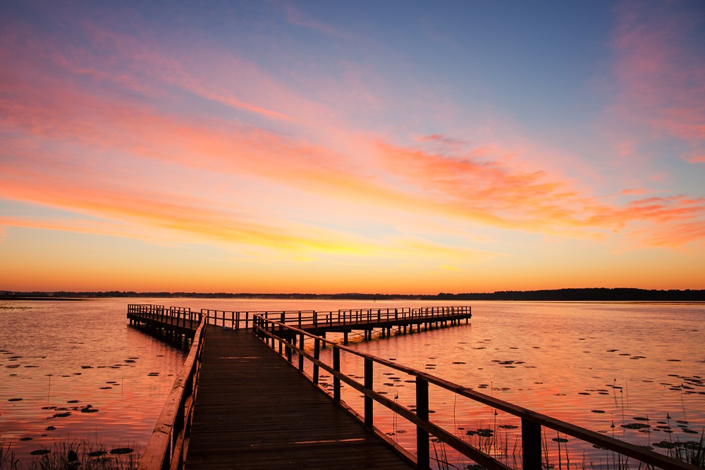 اسکله چوبی در غروب سرخ آسمان