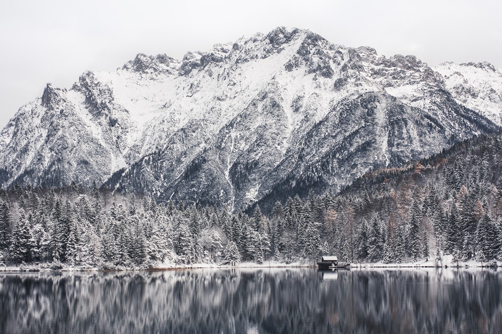 انعکاس کوهها و کلبه چوبی در دریاچه برفی