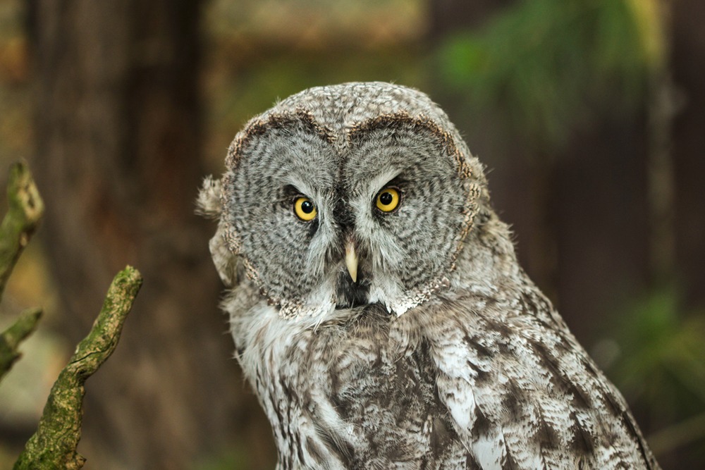 جغد خاکستری بزرگ نشسته نگاه به دوربین