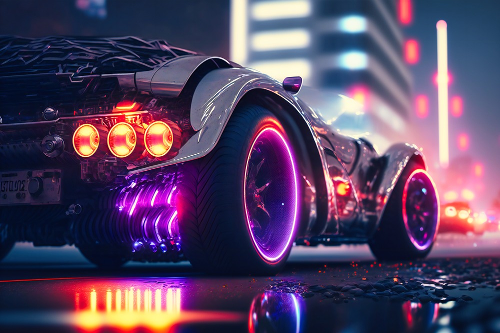 خودرو براق با نورهای نئون منظره شهری