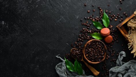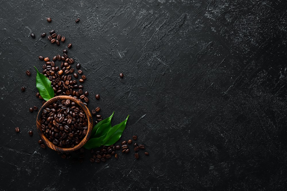 دانه های قهوه در کاسه چوبی زمینه مشکی