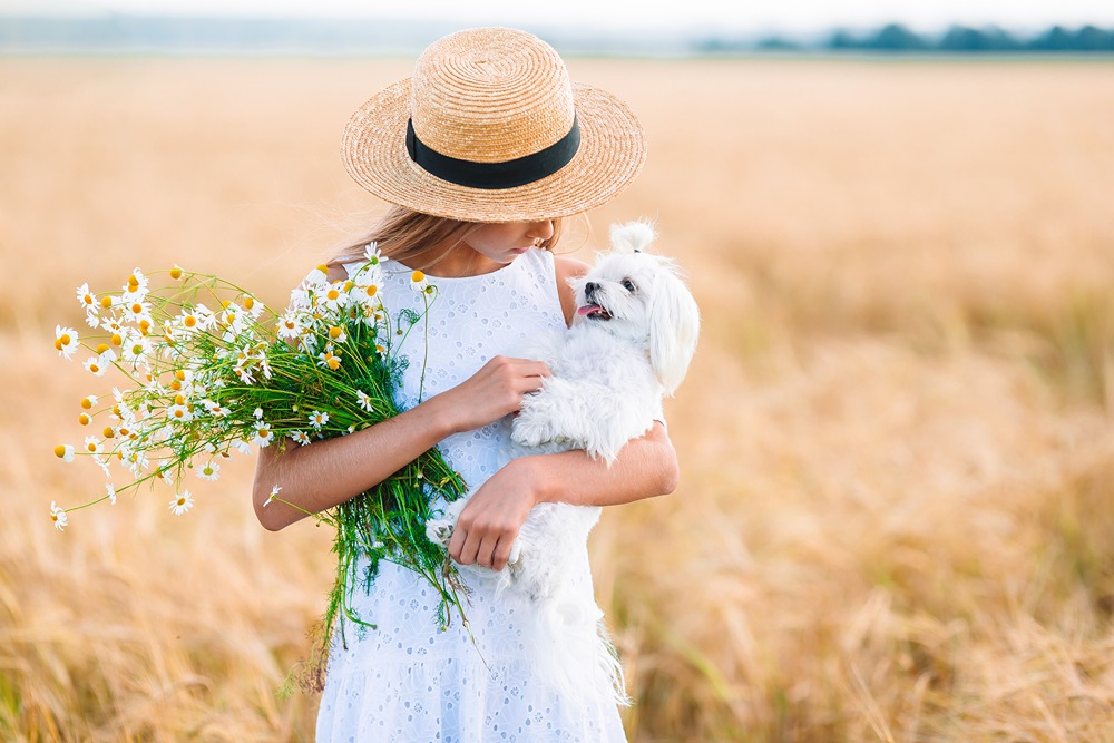 دختر بچه با سگ کوچک در گندم زار