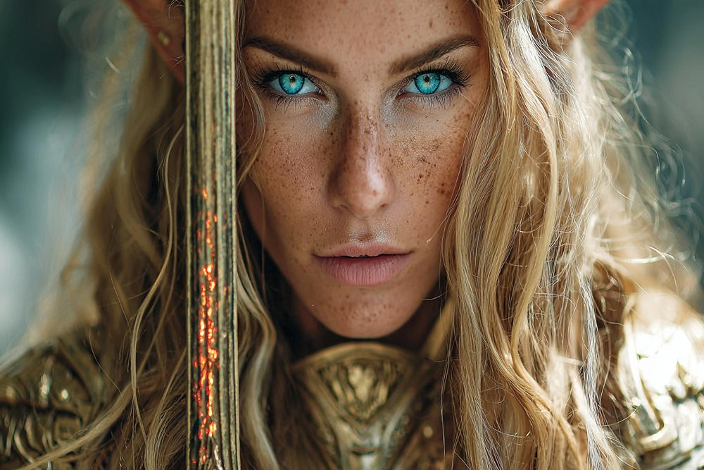 زن الف مو طلایی فانتزی با زره طلایی