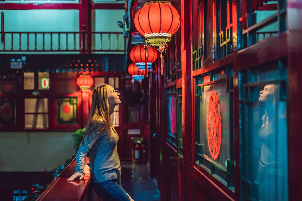 زن توریست در حال نگاه به فانوس سنتی چینی