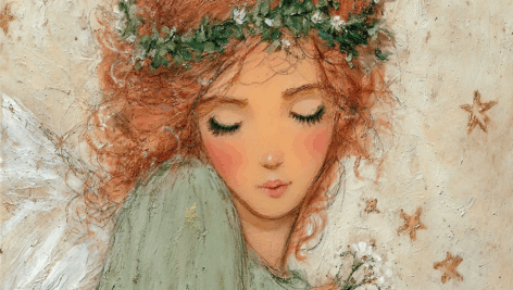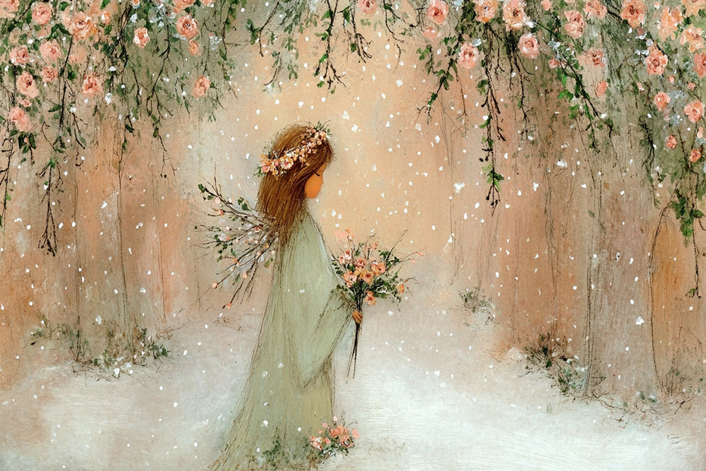 فرشته کوچک با تاج گل رز صورتی در زمستان
