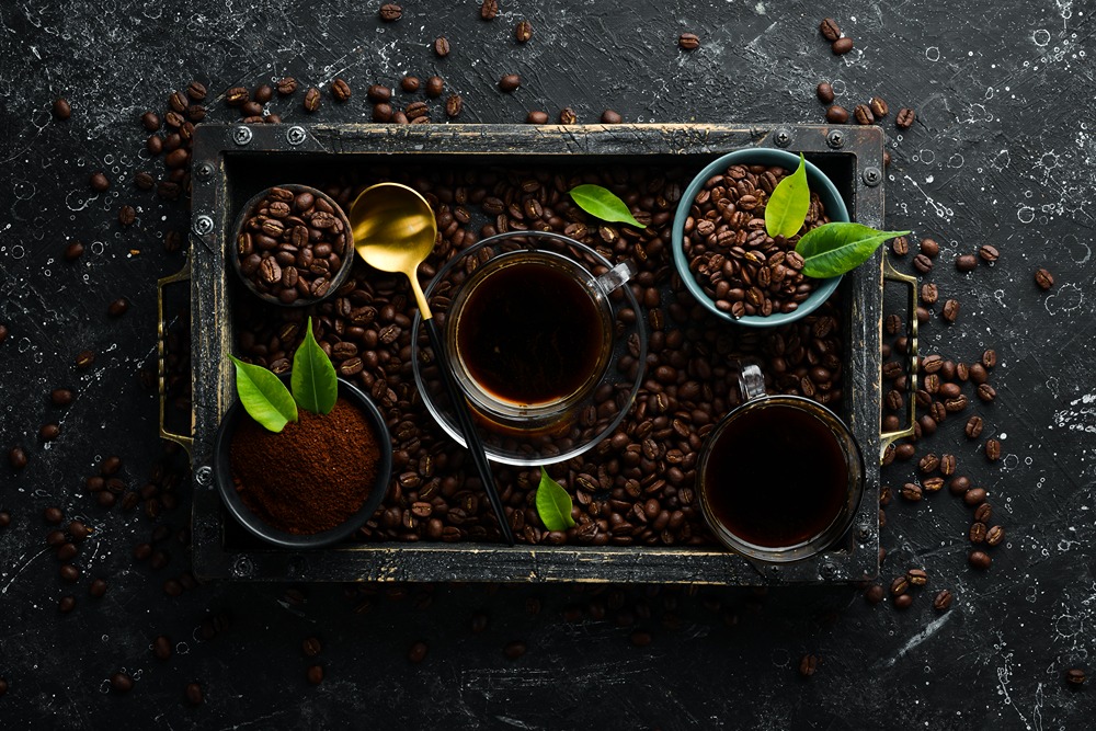 قهوه و فنجانهای قهوه در سبد چوبی