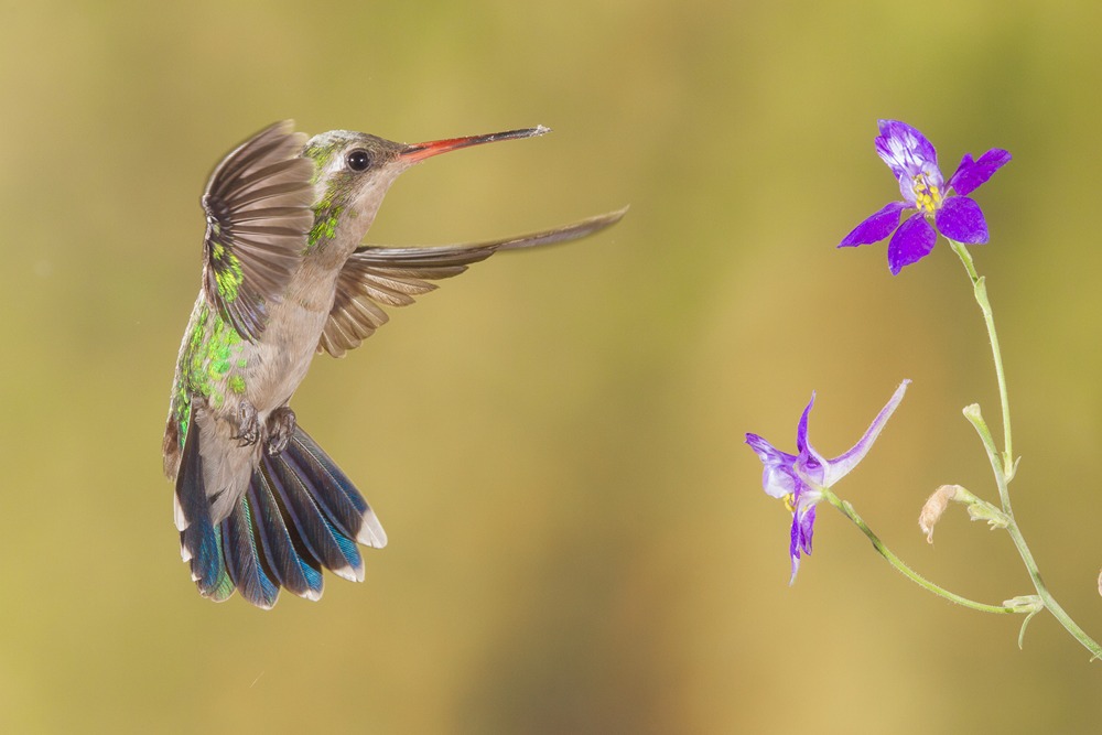 مرغ مگسخوار در حال پرواز کنار گل بنفش