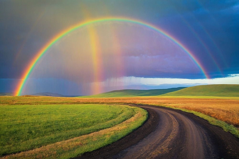منظره جاده و رنگین کمان و آسمان آبی
