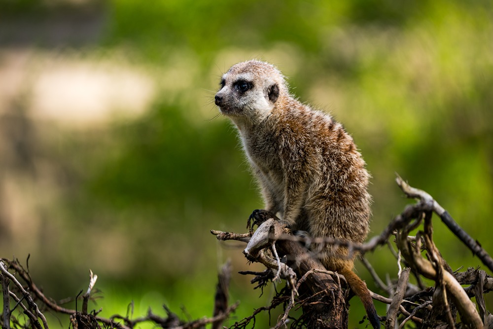 میرکت نشسته روی شاخه زمینه جنگل تار