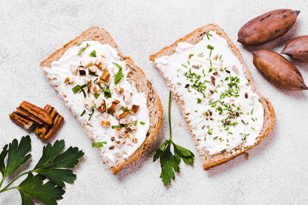 نان تست با پنیر و گردو پهن شده نمای بالا
