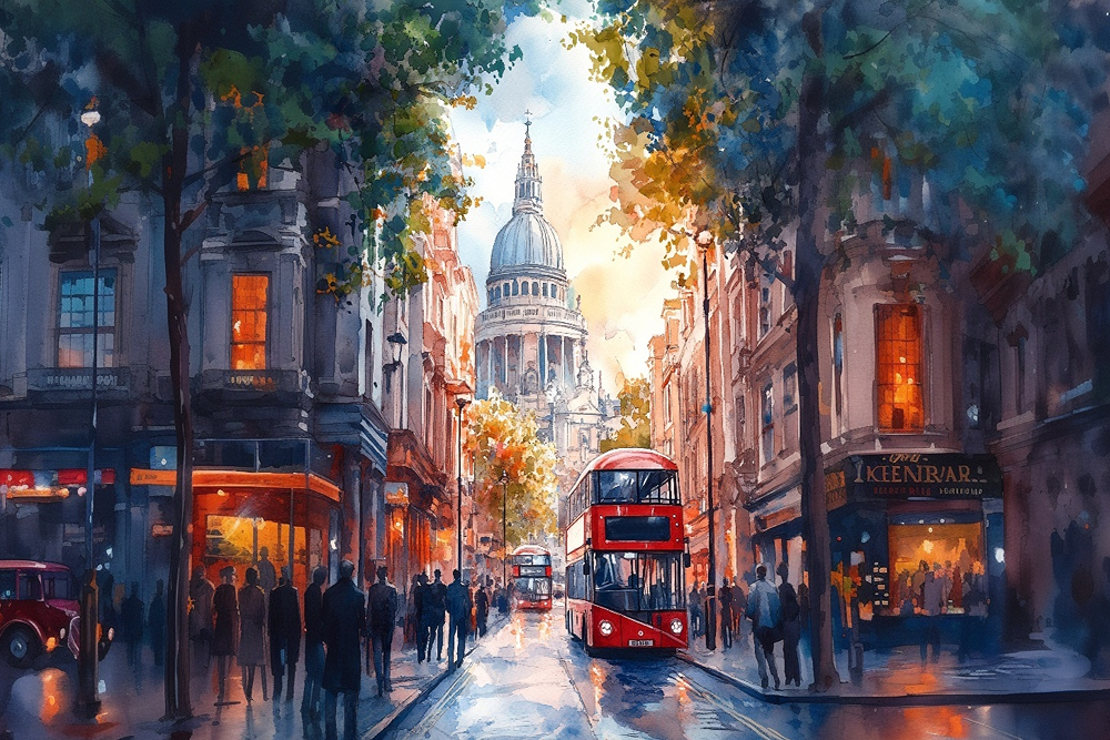 نقاشی آبرنگ رنگارنگ شهر لندن