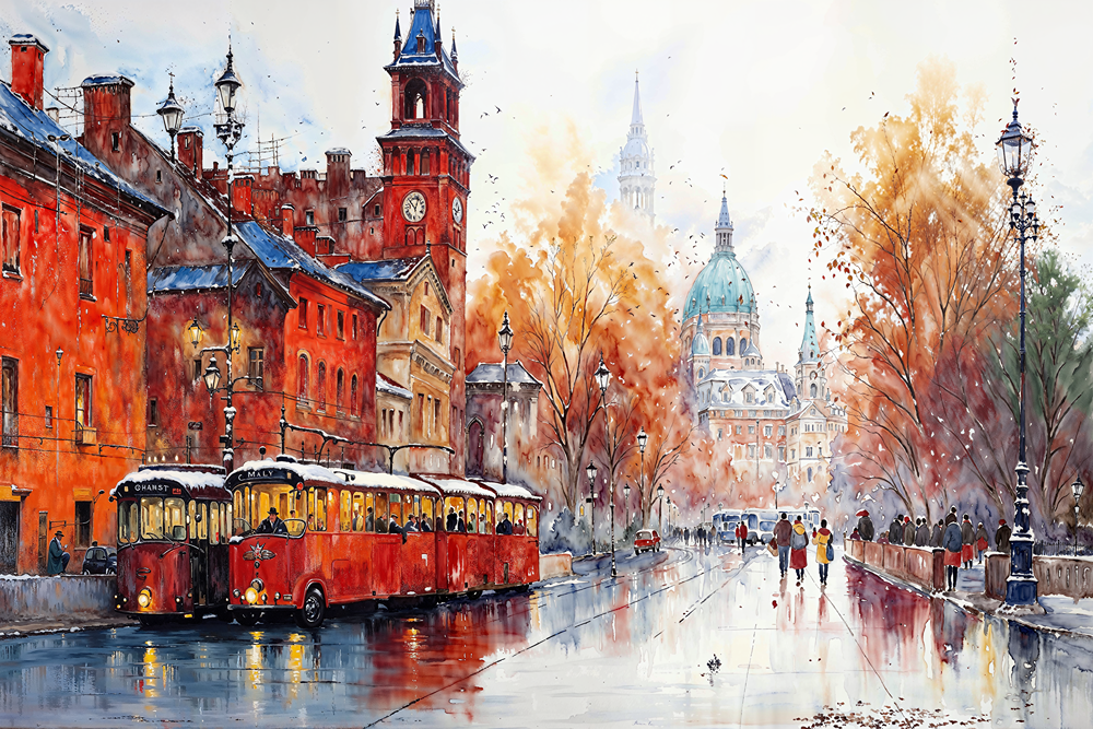 نقاشی آبرنگ شهر پاریس غرق در رنگ پاییز