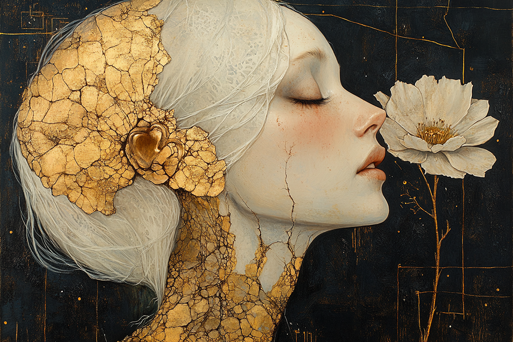 نقاشی رنگ روغن یک زن با گل سفید طلایی
