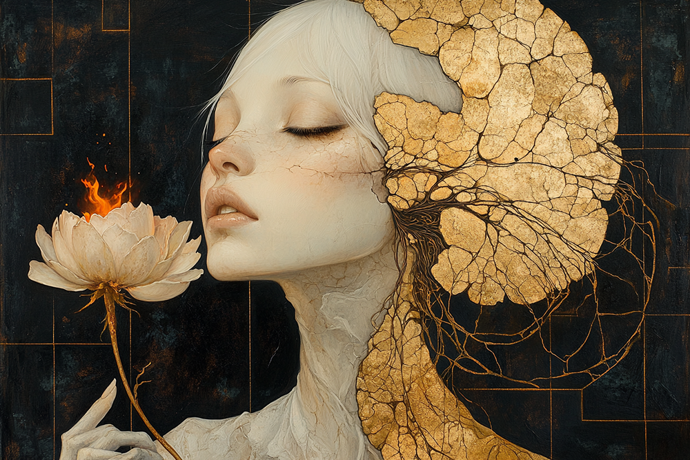 نقاشی رنگ روغن یک زن گل سفید طلایی