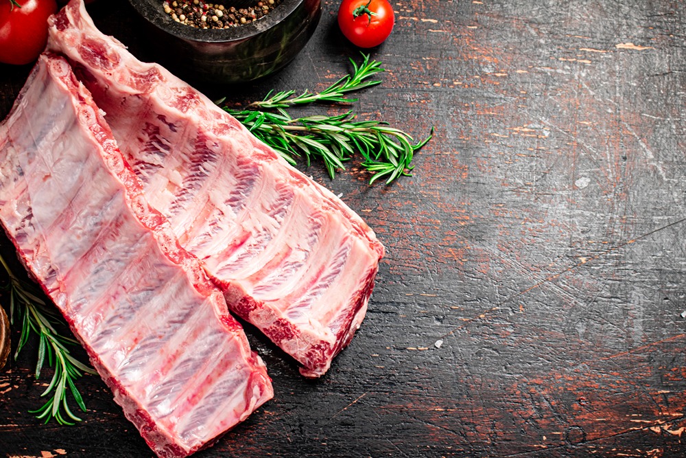 نمای بالا دنده خام با ادویه و گوجه فرنگی
