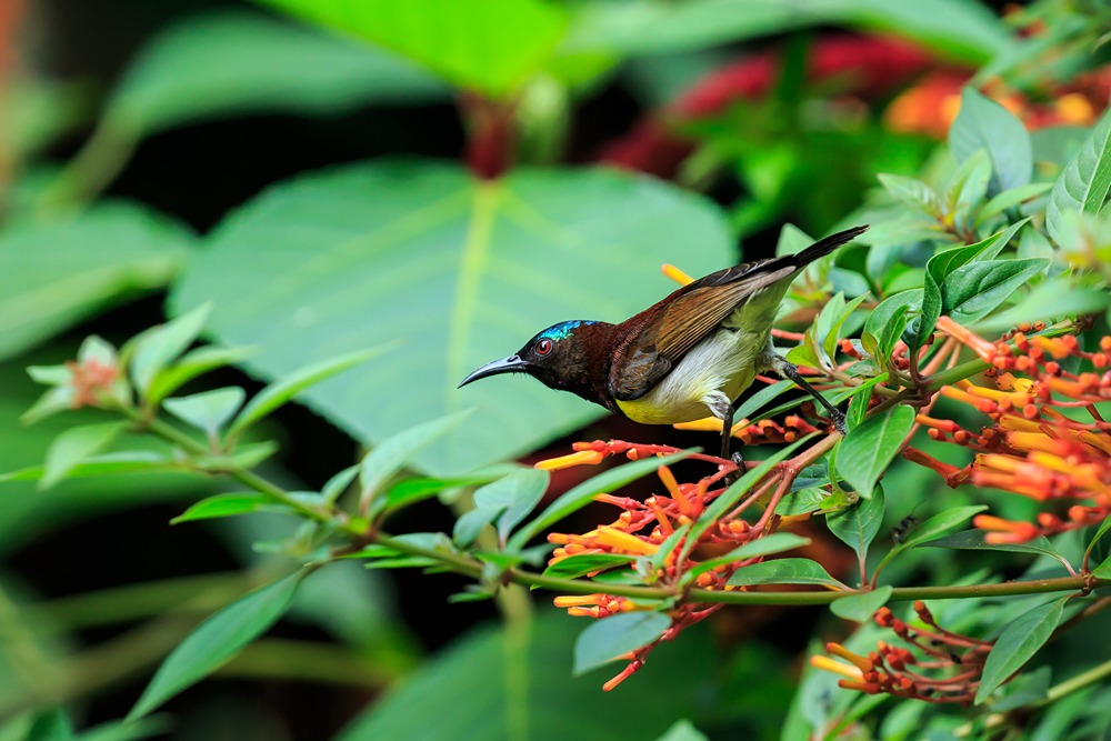 پرنده شهدخوار پشت بنفش روی گل قرمز