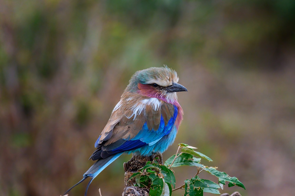 پرنده غلتکی با سینه یاس بنفش روی شاخه