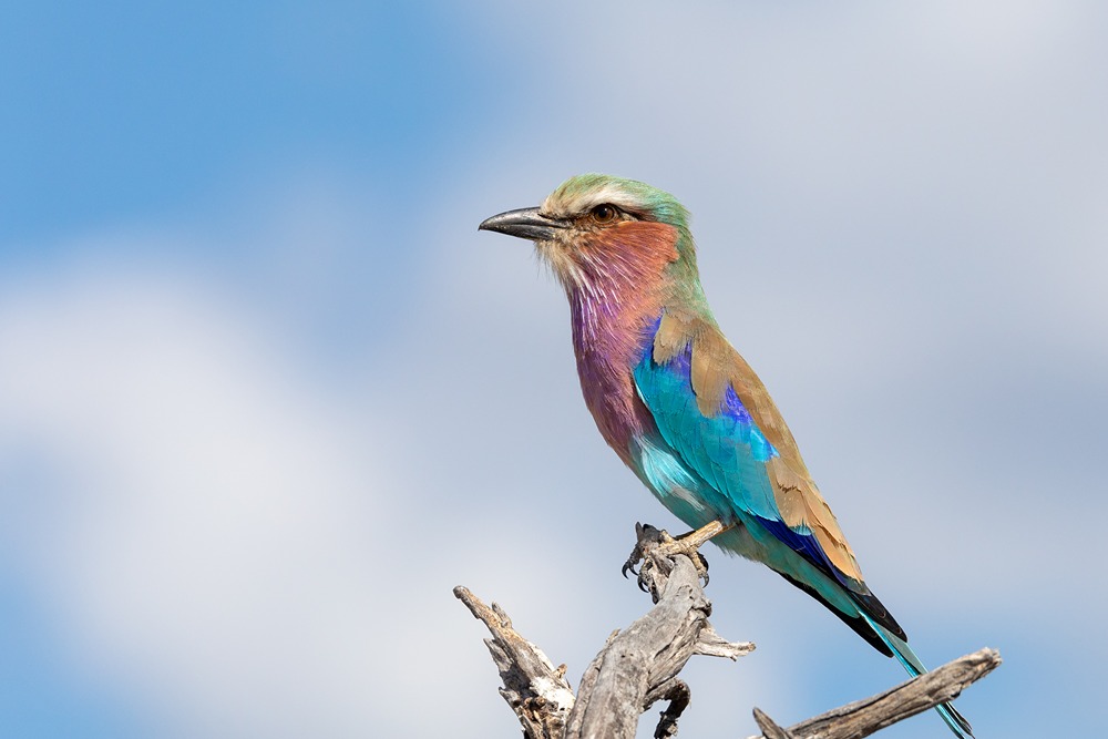 پرنده غلتکی با سینه یاس زمینه آسمان آبی