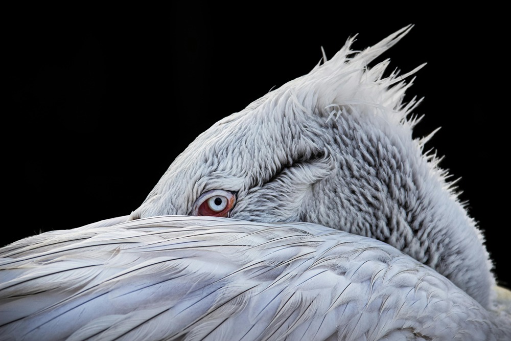 کلوز آپ پلیکان دالماسی زمینه مشکی
